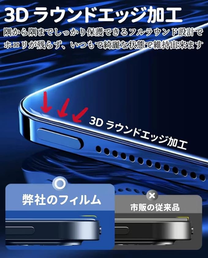 ?フィルムの端(エッジ)に3Dラウンドエッジ加工しており、四隅からの衝撃を受けにくくし、操作時のフィット感を高めます。?飛散防止加工によって、万が一割れた際も、ガラス片が飛び散らない安心設計のガラスフィルムです。
