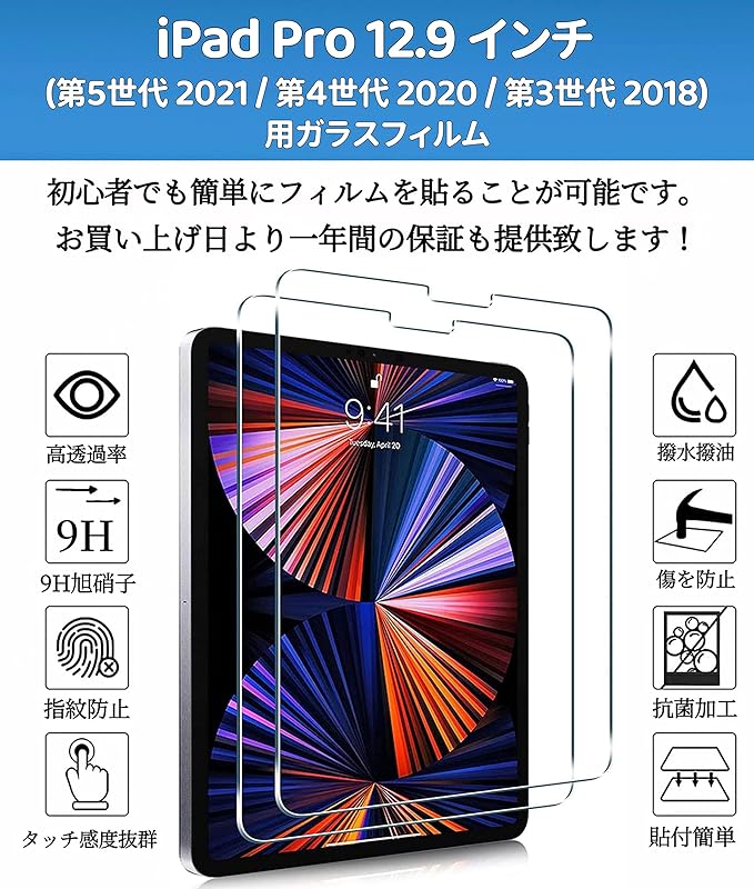 【2枚セット】【限定ブランド】FilmWonder(フィルムワンダ)iPad Pro 12.9 (2022 第6世代 M2 / 第5世代 2021 / 第4世代 2020 / 第3世代 2018)用ガラスフィルム 強化液晶保護フィルム 全面保護 日本旭硝子製 9H 高光沢 高透過率 自動吸着 指紋防止 飛散防止 気泡防止 撥水撥油 反射防止