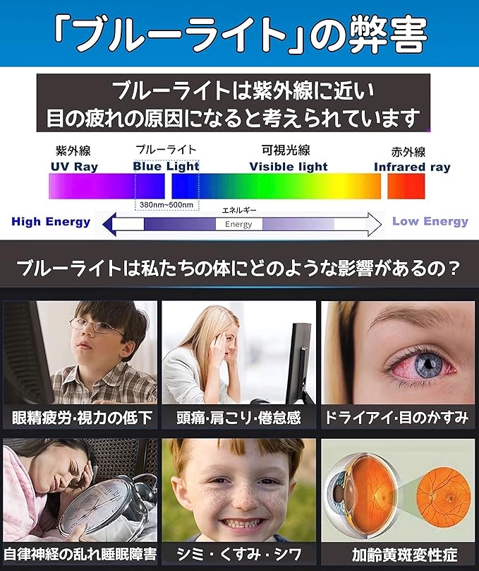 ?ブルーライトは眼の疲れだけでなく身体に悪影響、頭痛、不眠などの原因になります。こちらのフィルムは液晶画面から放出されるブルーライトがカットできます。さらに全光線透過率は高くて画面を見やすく、ブルーライトを効率的にカットするバランスを実現しました。対応機種本体の液晶画面を保護するだけでなく、目に影響を及ぼすブルーライトを色調を崩すことなく低減し、まぶしさやチラつきを抑えます。