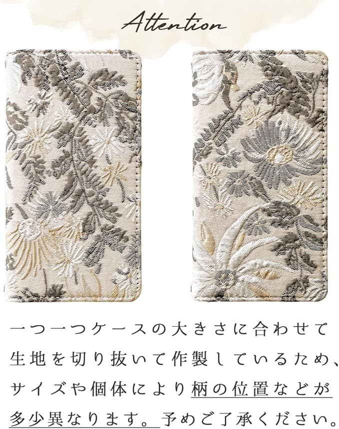 【 オリエンタルな雰囲気が魅力 】少し凹凸のあるボタニカルジャガード生地を使用した手帳型ケースになります。印刷ではなく織生地ですので摩擦や引っ掛かり等にお気を付け下さい。