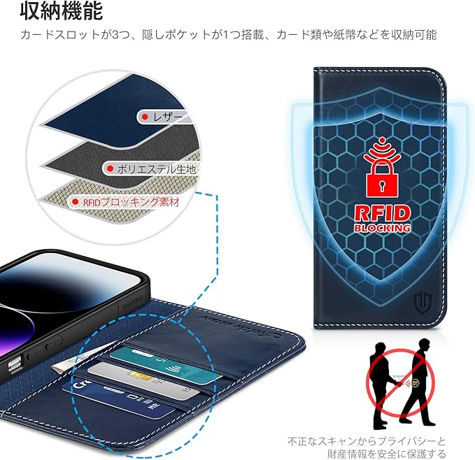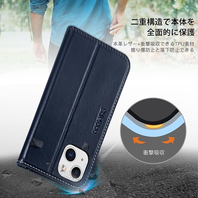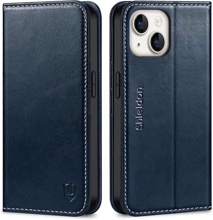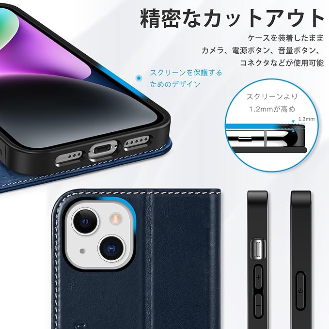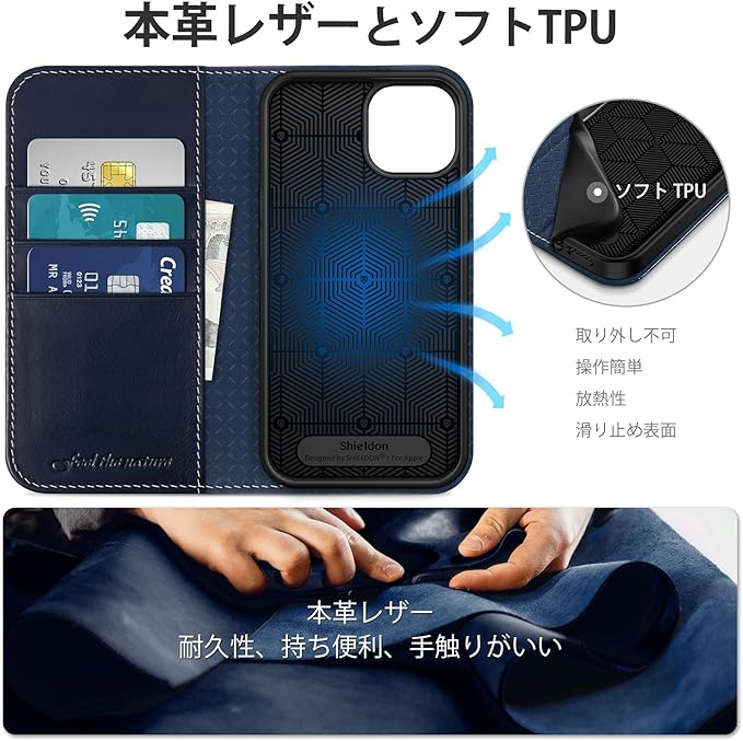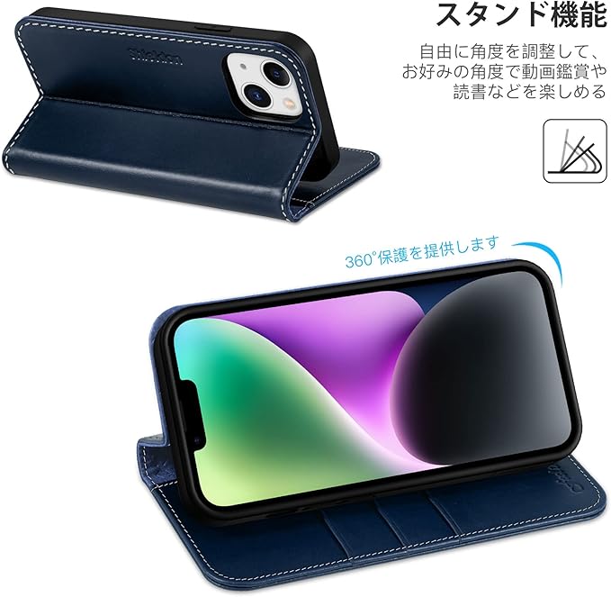 SHIELDON iPhone 14 対応 ケース 手帳型 アイホン14対応 ケース 本革レザー 衝撃吸収 全面保護 TPU素材 カード収納 財布型 横置きスタンド機能 マグネット内蔵 [RFIDブロッキング] あいふぉん14 スマホケース 5G 2022年発売 6.1インチ レトロネイビーブルー