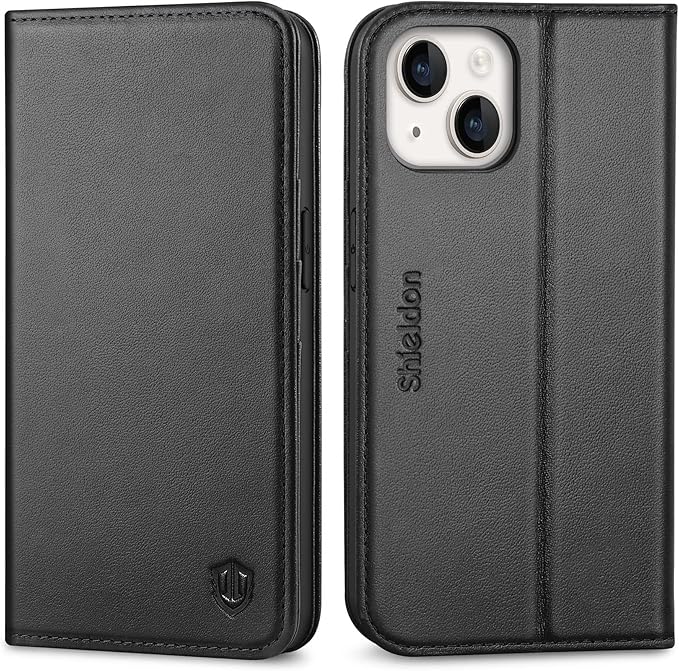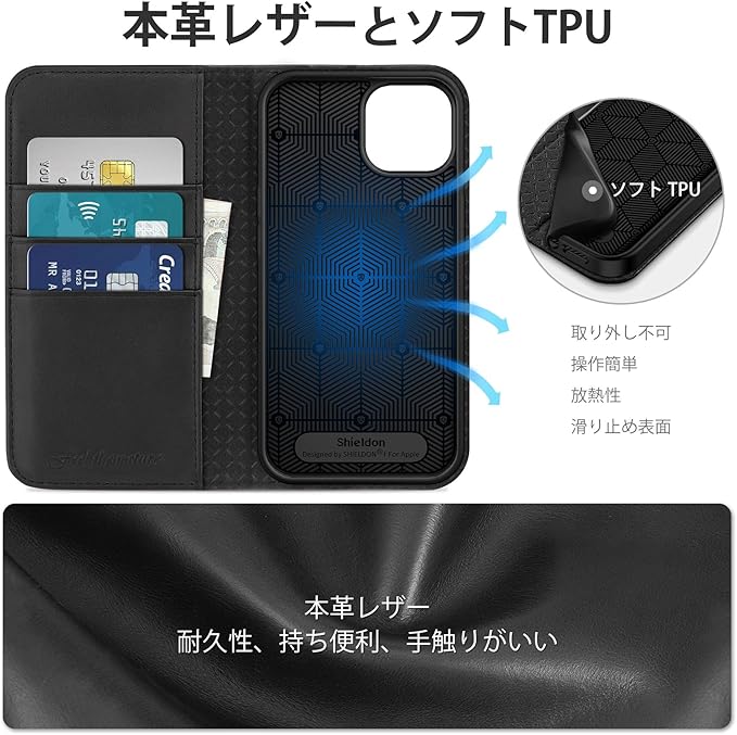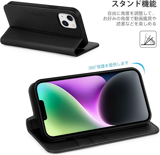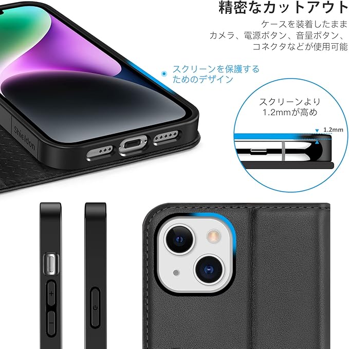 SHIELDON iPhone 14 対応 ケース 手帳型 本革レザー アイホン14 対応 ケース 衝撃吸収 全面保護 TPU素材 カード収納 財布型 横置きスタンド機能 マグネット内蔵 [RFIDブロッキング] あいふぉん14 スマホケース 5G 2022年発売 6.1インチ ブラック
