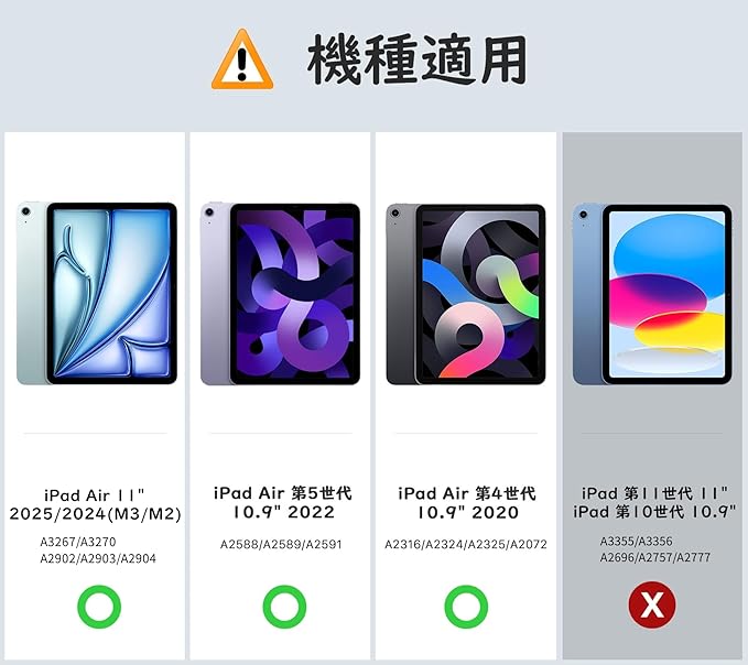 「適用機種」2025年発売のiPad Air 11インチ M3(モデル番号:A3267/A3270)、2024年発売のiPad Air 11インチ(M2)(モデル番号:A2902/A2903/A2904)、2022年発売のiPad Air 第5世代(モデル番号:A2591/A2589/A2588)と2020年発売のiPad Air 第4世代(モデル番号:A2316/A2324/A2325/A2072)10.9インチに対応できます。ご注意:iPad 第10世代 10.9インチ、iPad Air 1