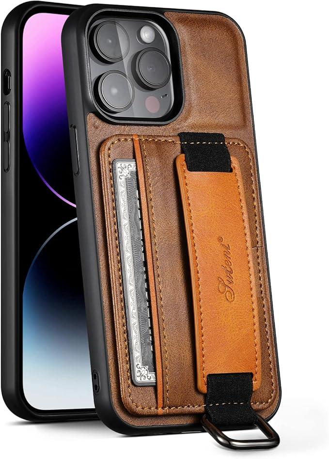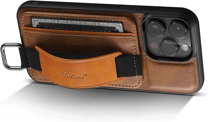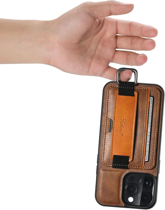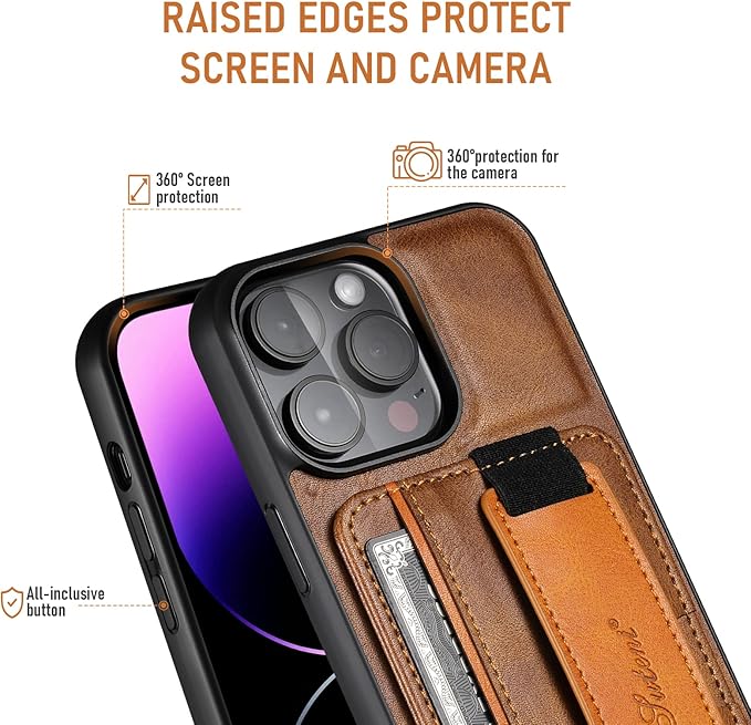 Mcxiancrl iPhone 14 用 グリップケース ハンディベルト バンパー型 カバー スライド ベルト伸縮性 ハンドメイド 3枚カード収納 ストラップホール ストラップリング バンド リング付き 落下防止 横置きスタンド機能 スリム 薄型 おしゃれ PU レザー