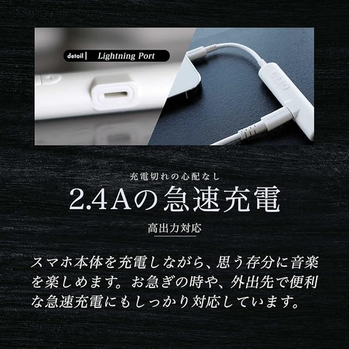 iPhoneで充電しながら有線イヤホンが使える:お手持ちのイヤホンやヘッドフォンをLightningコネクタに変換するオーディオアダプターです。充電しながら音楽も聴けるLightningポート付きなのでバッテリー残量を気にせず楽しめます。