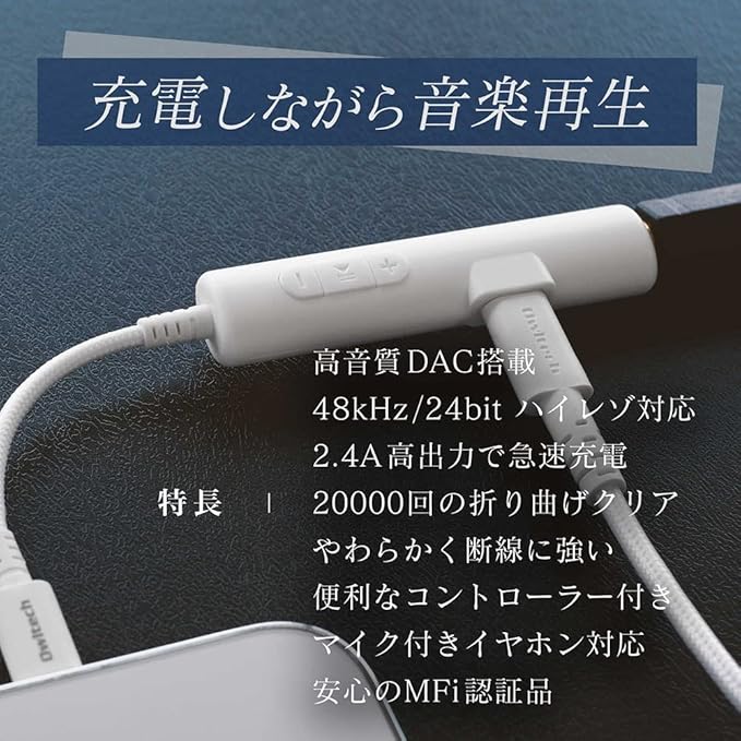 オウルテック オーディオ変換アダプター 充電用ライトニングポート付き ライトニング to 3.5mmミニジャック ハイレゾ対応 48kHz/24bit DAC MFi認証 イヤホンマイク対応 15cm ホワイト OWL-CBLTF35LT01-RWH