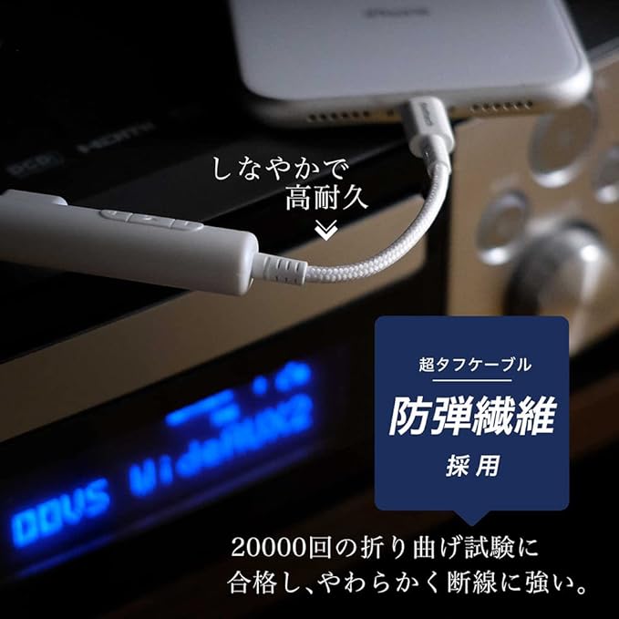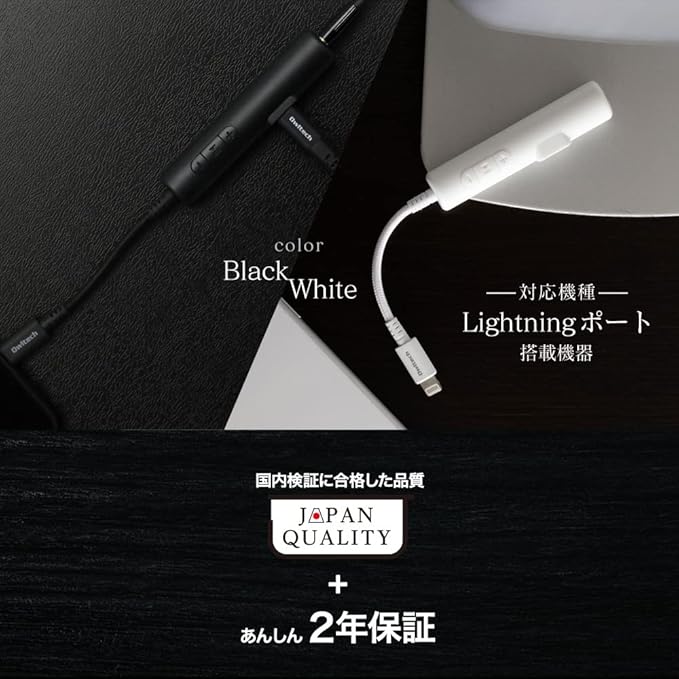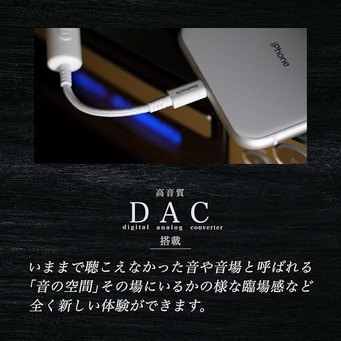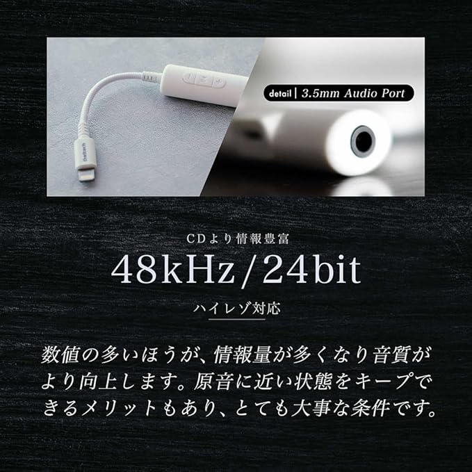 DAC搭載で48kHz/24bitのハイレゾにも対応:DACとは、Digital to Analog Converterの略で、デジタル信号をアナログ信号に変換する部品のことです。アダプタ内部にDACを搭載しているため、信号の劣化を最小限に抑え、ノイズが少なく高音質のまま信号を伝えることができます。48kHz/24bitのハイレゾにも対応しており、気軽に品質の高い音質を再現することができます。再生機器、イヤホン、ファイル形式がハイレゾ対応している必要があります。