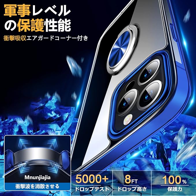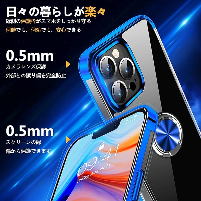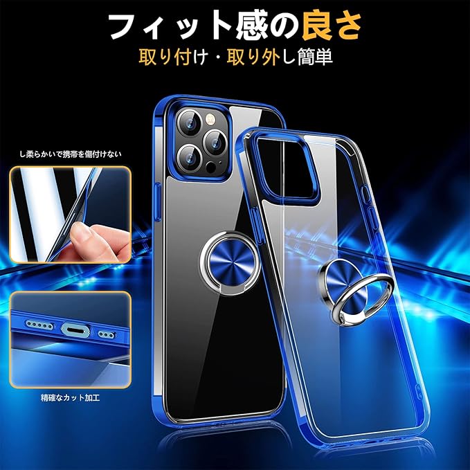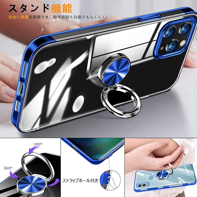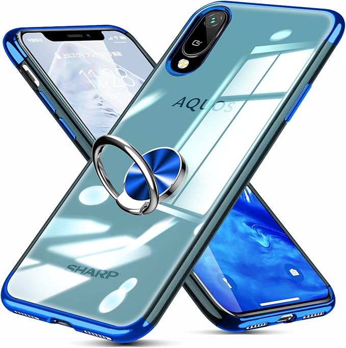 AQUOS Sense 3 ケース Sense 3 lite ケース リング付き クリア SH-02M SHV45 SH-RM12 ケース TPU 透明 メッキ加工 耐衝撃 車載ホルダー対応 スタンド機能 防塵 薄型 軽量 落下防止 一体型 変形防止 アクオスセンス3 カバー 青 MJJ-1055-13-03