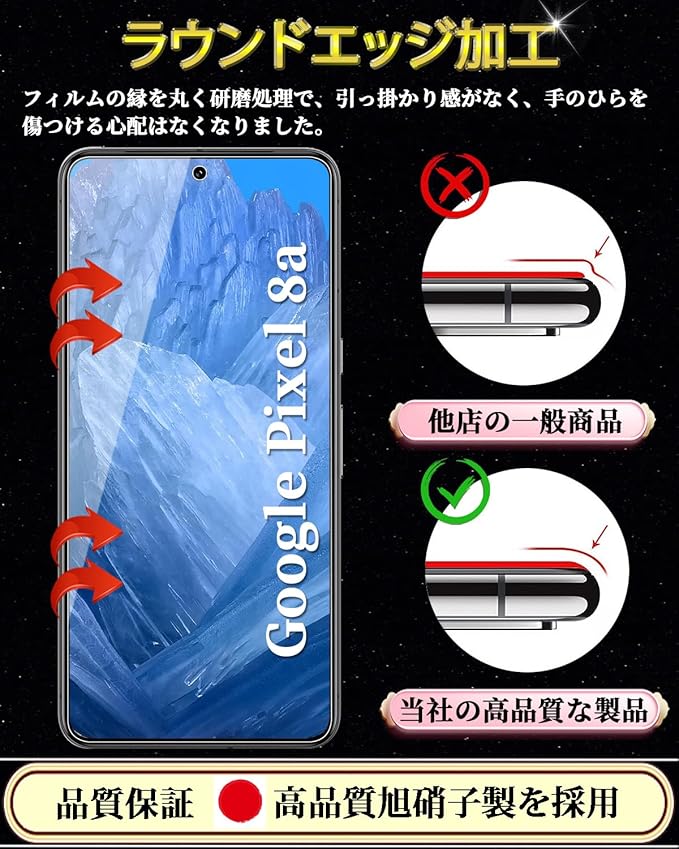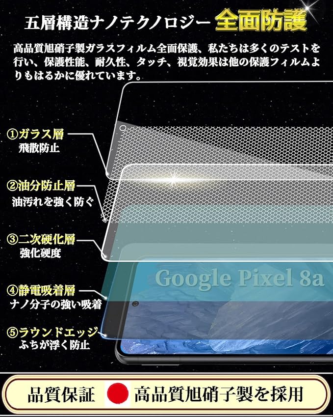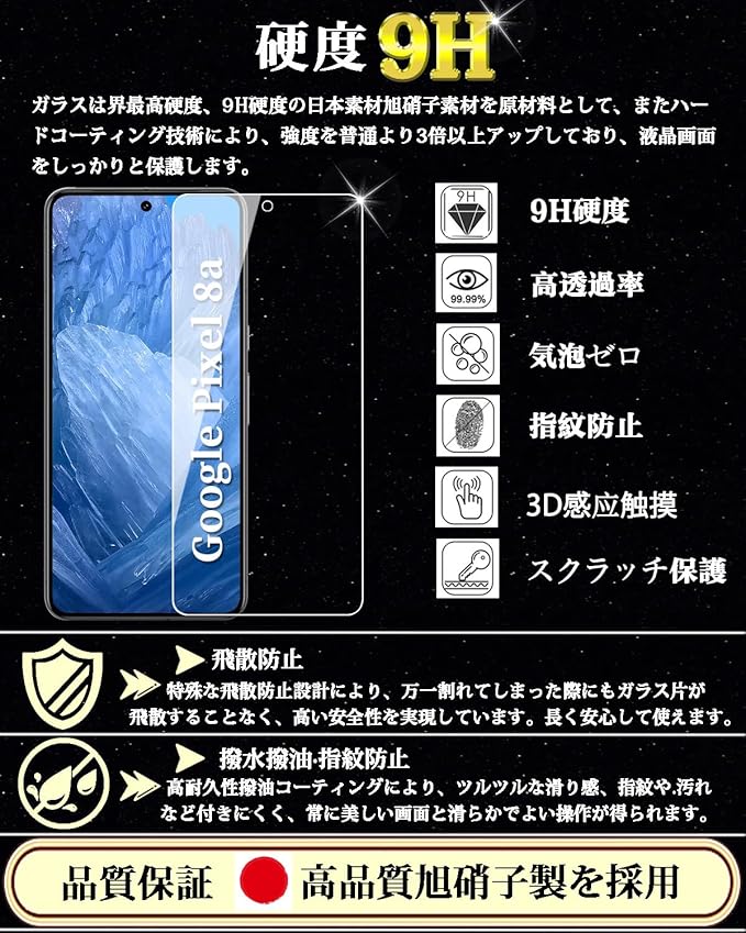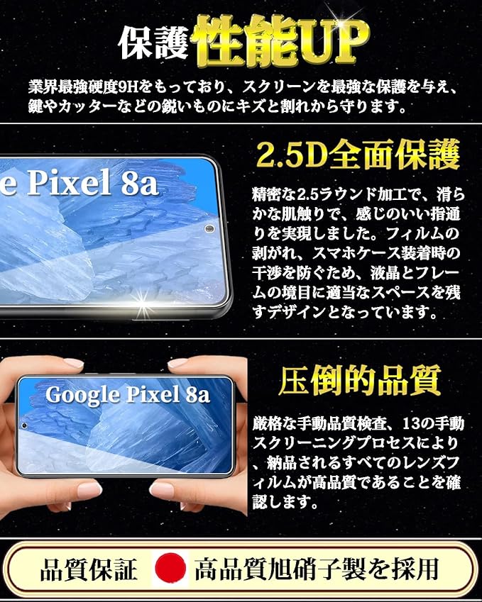 Google Pixel 8a ガラスフィルム グーグルピクセル8a 強化ガラス 保護フィルム【2枚入り】 旭硝子日本製 硬度9H 全面保護 高透過率 貼り付け簡単 自動吸着 気泡防止 指紋防止 キズ防止 撥水撥油 指紋認証対応 6.1'';
