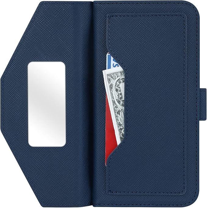 【実用性(1):収納力抜群】横入れ式のフリーポケット、窓口式のカード入れ、カードスロット複数付き、それにピタッと閉じるマグネット式のフリップの裏側に化粧鏡も付き、大事なカードたちを完全に保護する上に、実用性と多用性も存分に考えておきました。ちょっとした買い物や散歩にはショルダーにして、スマホだけで出掛けて十分です。