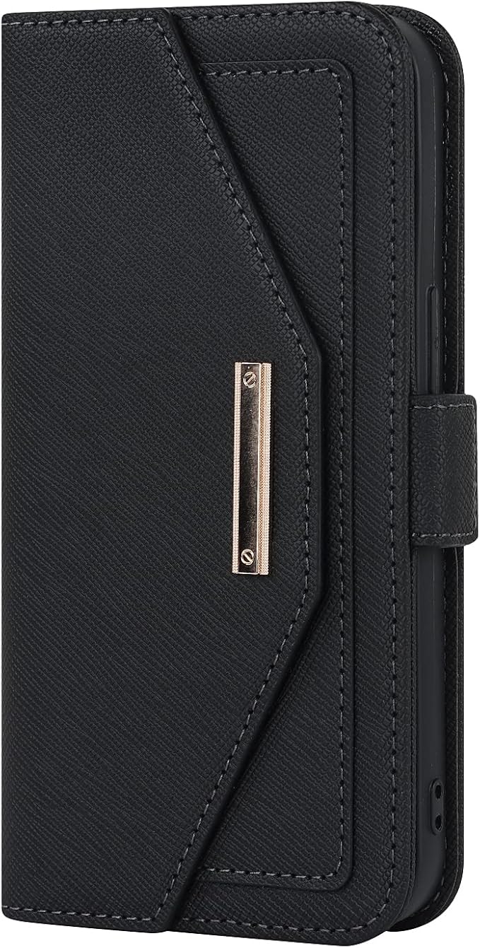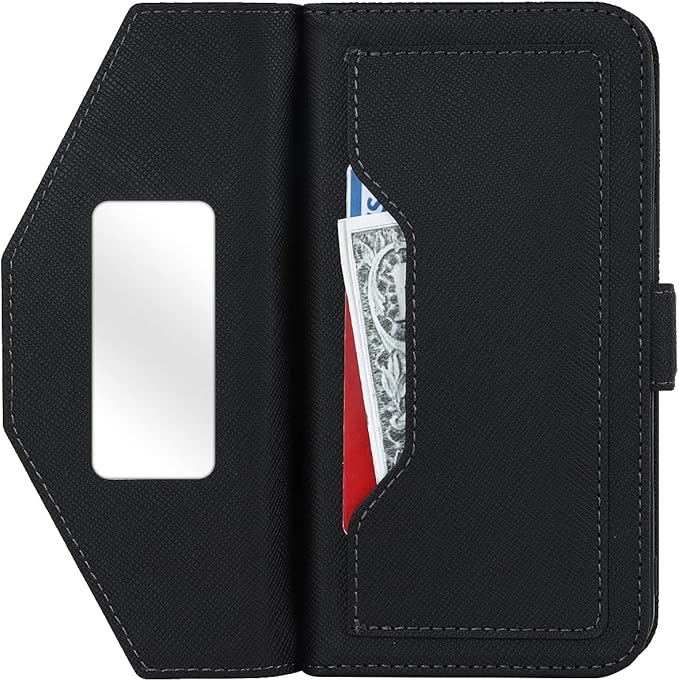【実用性(1):収納力抜群】横入れ式のフリーポケット、窓口式のカード入れ、カードスロット複数付き、それにピタッと閉じるマグネット式のフリップの裏側に化粧鏡も付き、大事なカードたちを完全に保護する上に、実用性と多用性も存分に考えておきました。ちょっとした買い物や散歩にはショルダーにして、スマホだけで出掛けて十分です。