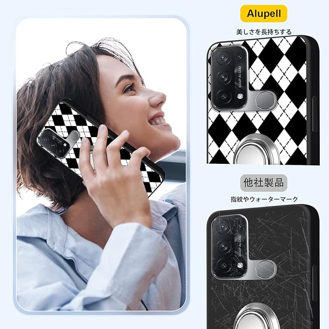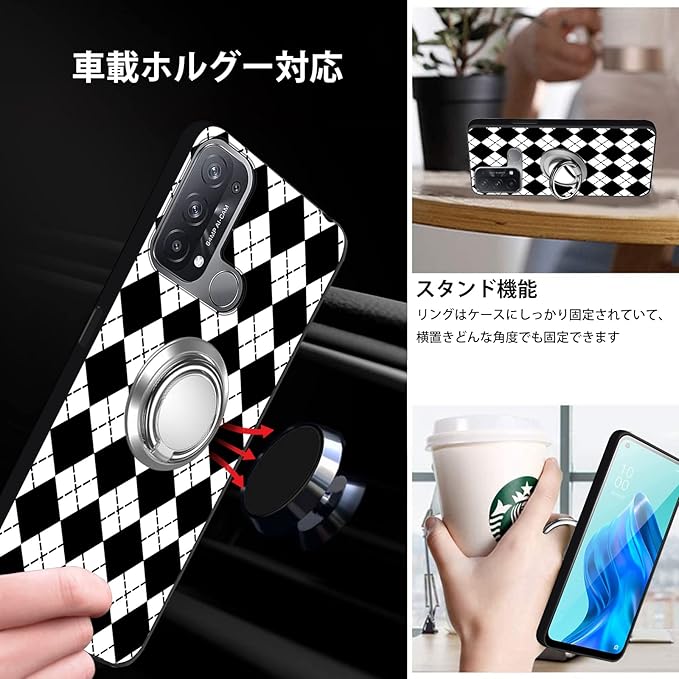 OPPO Reno5 A ケース リング tpu 耐衝撃 薄型 軽量 指紋防止 360°回転 車載ホルダー対応 防塵 一体型 人気 携帯カバー ストラップホール付き (白黒ひし形)