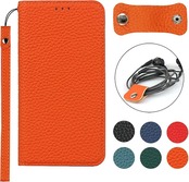 【素材】: シンプルさと高級感を兼ね備えたデザイン, 外殻は牛革製品 本革レザーを採用しており, 内側はスマートフォンにフィットし、隙間なくそれを保護するソフトTPUシリコーン材料で作られています。