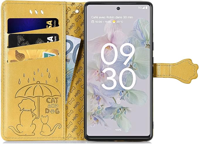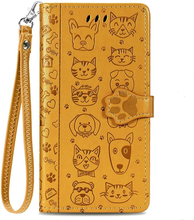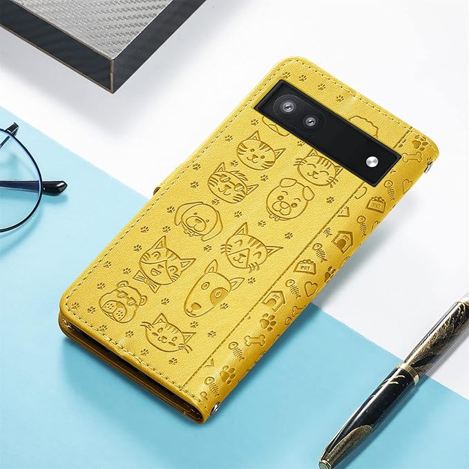 Google Pixel 6a 用 ケース 手帳型 おしゃれ 可愛い アニマル 猫 ストラップ付き マグネット式 カード収納 小銭入れ スタンド機能 グーグル ピクセル 6a かわいい ネコ 犬 手帳 カバー スマホケース (イェロー)