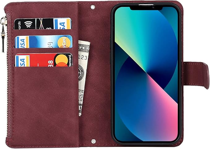 Eastwave アイフォン14 Plus ケース for iPhone 14plus 縄掛けケース for iPhone14 Plus 手帳型 財布型 ICカード コインポケット ストラップ付き カード 収納 小銭入れ ファスナーポケット付き PUレザー 6色レッド