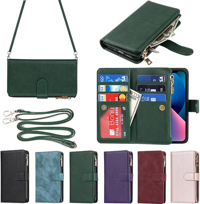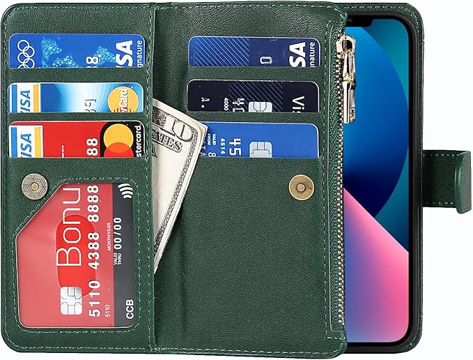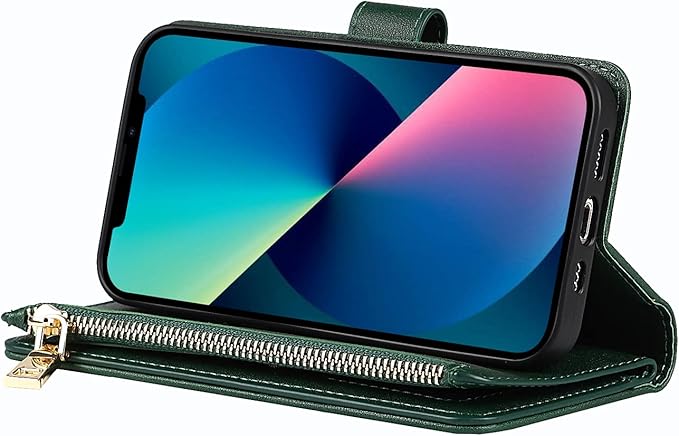 Eastwave アイフォン14 Plus ケース for iPhone 14plus 縄掛けケース for iPhone14 Plus 手帳型 財布型 ICカード コインポケット ストラップ付き カード 収納 小銭入れ ファスナーポケット付き PUレザー 6色グリーン