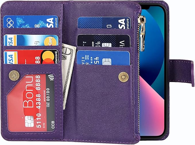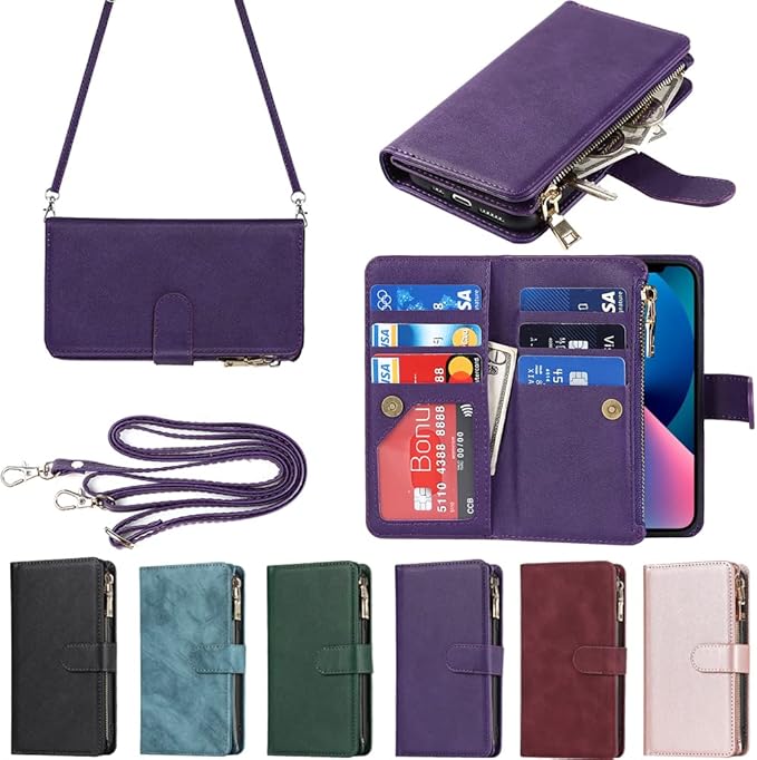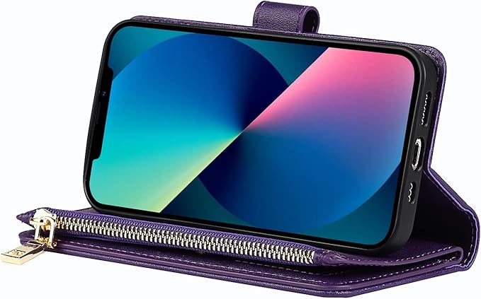 Eastwave アイフォン14 ケース iPhone 14 縄掛けケース iPhone14 手帳型 財布型 ICカード コインポケット ストラップ付き カード 収納 小銭入れ ファスナーポケット付き PUレザー 6色パープル