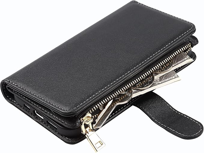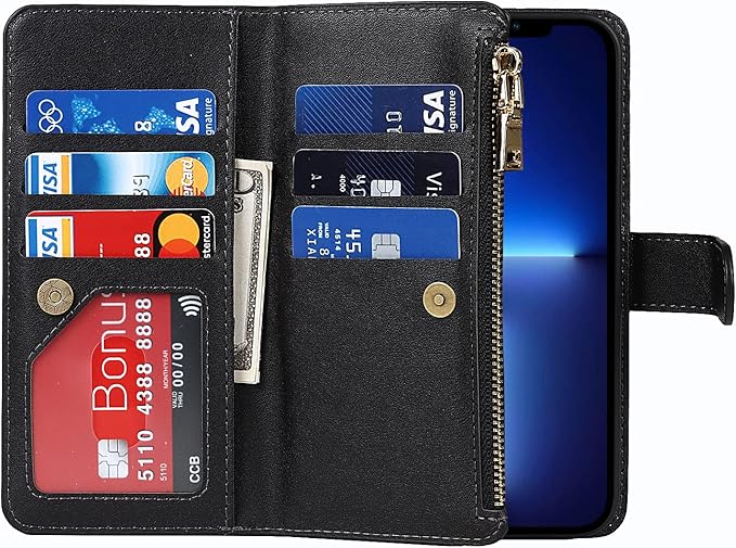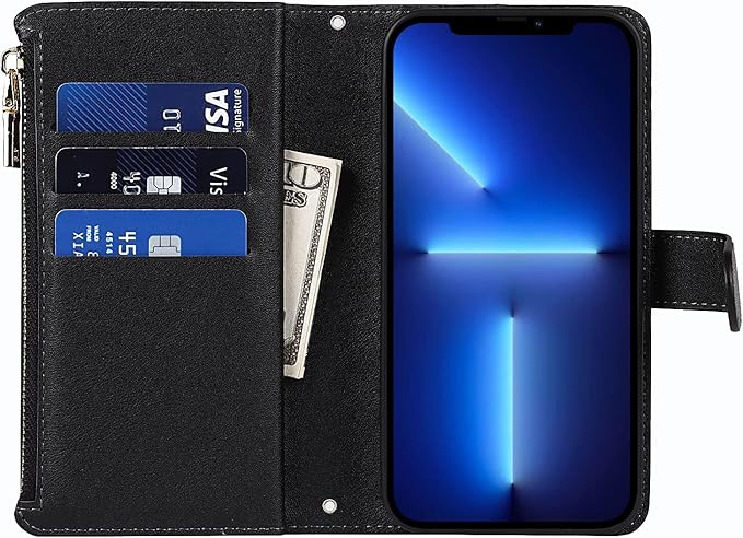 Eastwave アイフォン14 Pro Max ケース for iPhone 14promax 縄掛けケース for iPhone 14 Pro Max 手帳型 財布型 ICカード コインポケット ストラップ付き カード 収納 小銭入れ ファスナーポケット付き PUレザー 6色ブラック