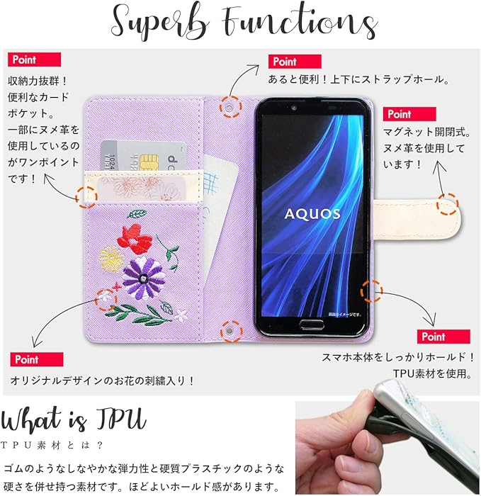 iPhone 14 plus 手帳型 ケース カバー iPhone14plus iPhone14plusケース iPhone14plusカバー iPhone14plus手帳ケース iPhone14plus手帳型ケース 手帳ケース 手帳型ケース スマホケース ちょいヌメ花刺繍 パープル