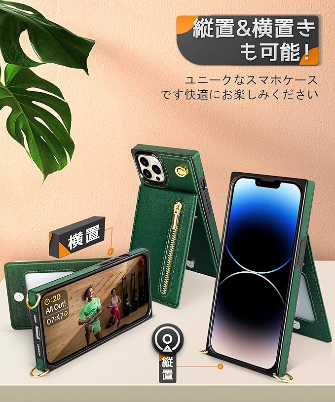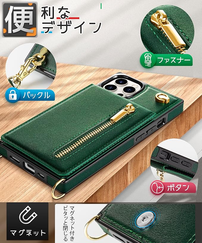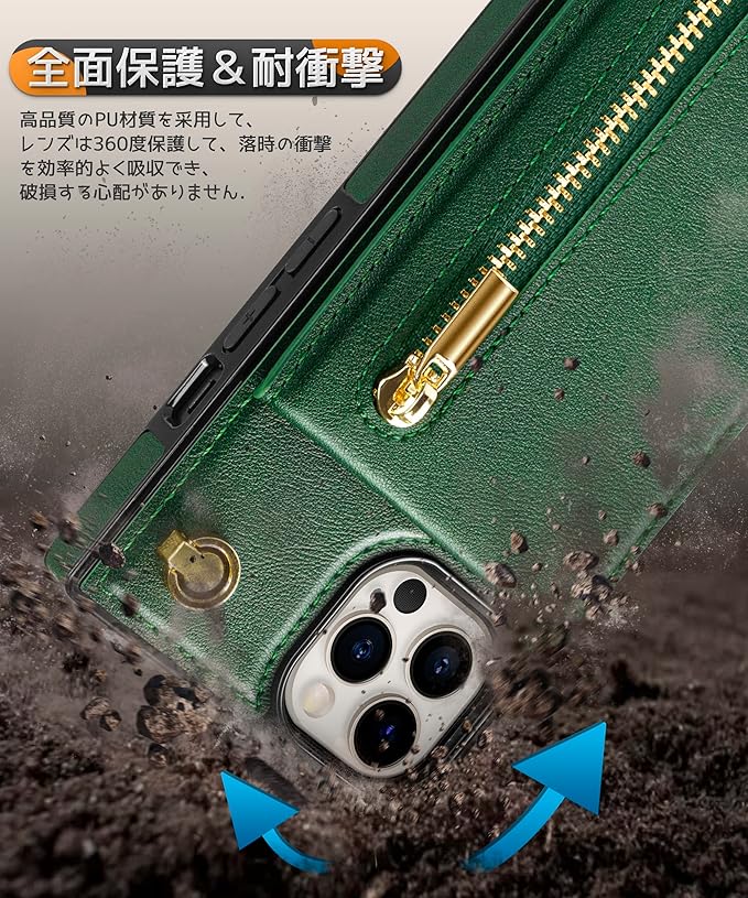 YIHARA iphone 14 Pro ケース手帳型 iphone 14 Pro スマホ ケース 財布型 iPhone 14 Pro 適用 携帯ケース 肩掛け 首かけ 斜めがけ ショルダー アイフォン14 Proケース手帳型 背面 カード収納 ストラップ付き 上下開 長さ調整可能 グリーン