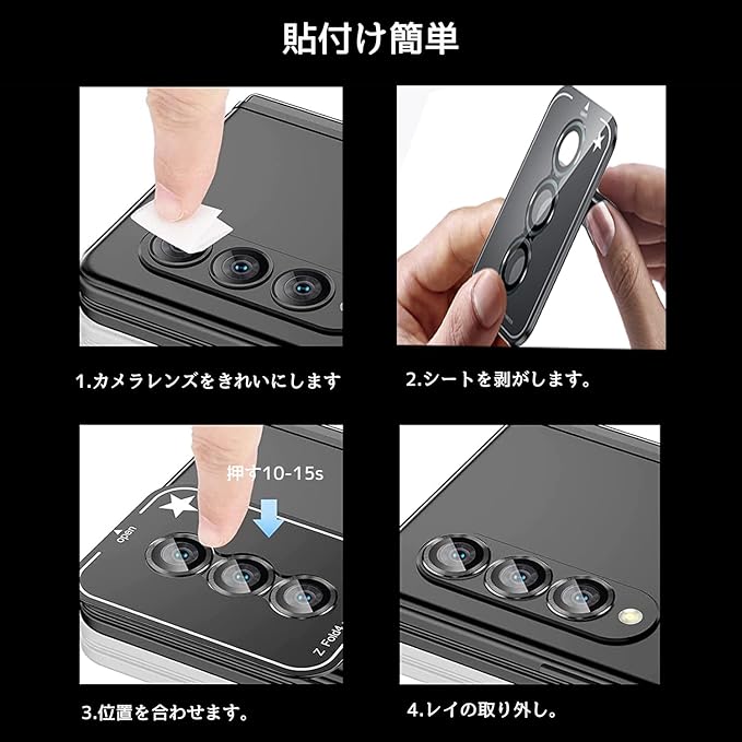 【高級感漂う単体仕上げ】Galaxy Z Flip4カメラフィルムGalaxy Z Flip4の独立型カメラために生まれた新作。フィルム全周はアルミ合金製リングとの融合で、本体のお洒落を向上しながら、ギャラクシーZ Flip4本体の色味にもぴったり、抜群な一体感、上品な見栄えでカメラの魅力を格段にアップ。それに薄0.3mmのデザインと0.5gの軽さで、分厚さやケースと干渉などの悩みは全くない、いつでも楽に使える。