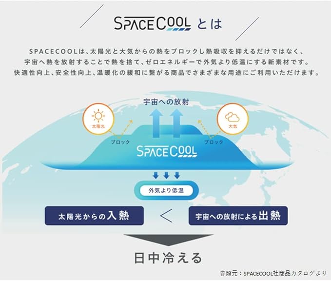 太陽光と大気からの熱をブロックし熱吸収を抑えるだけでなく、宇宙に輻射を行うことで熱を捨て、ゼロエネルギーで外気より低温にする新素材です。再剥離ができる粘着剤を使用しており、貼りなおす事が可能です。