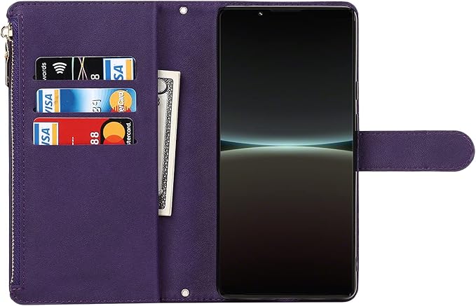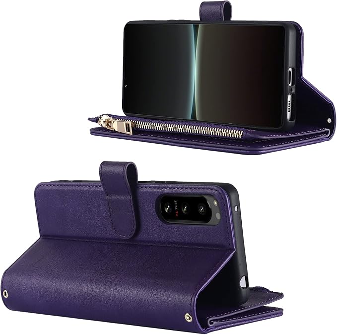 Eastwave for Sony Xperia 5 IV SO-54C ケース ソニー for Xperia 5IV SOG09 縄掛けケース 手帳型 財布型 ICカード コインポケット ストラップ付き カード 収納 小銭入れ ファスナーポケット付き PUレザー 6色パープル