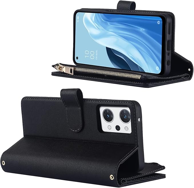 Eastwave OPPO Reno7 A ケース OPPO Reno 7A 縄掛けケース Reno7A 手帳型 財布型 ICカード コインポケット ストラップ付き カード 収納 小銭入れ ファスナーポケット付き PUレザー 6色ブラック
