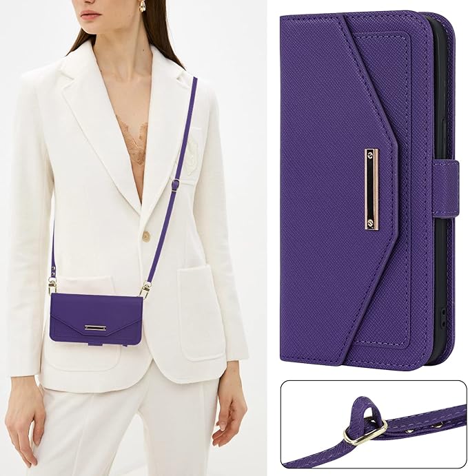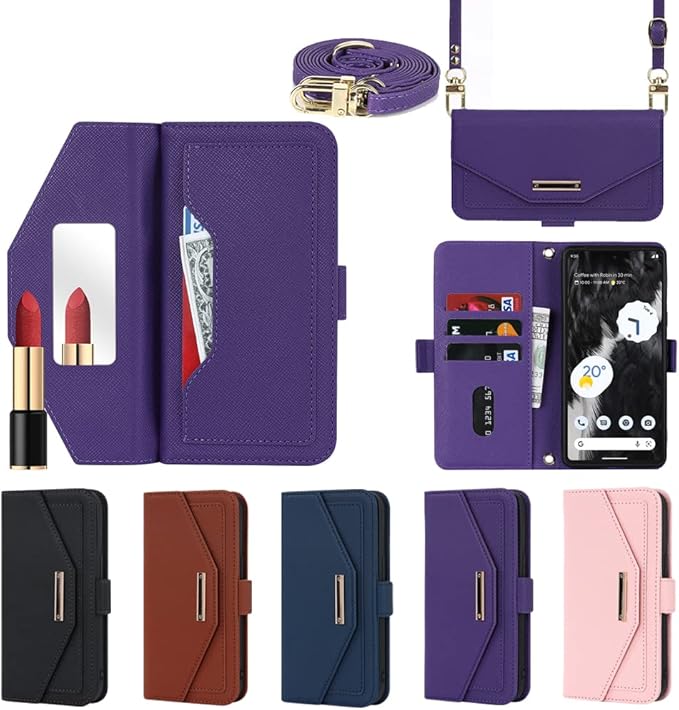 for Eastwave Google Pixel 7 ケース for Pixel7 縄掛けカバー 手帳型 手帳 for pixel 7 case チェック柄 鏡 ミラー付き 長ストラップ付き 肩掛け 革レザー 柔らかいTPU 多機能 財布型 カード収納 小銭入 れ スタンド機能 全面保護 5色パープル