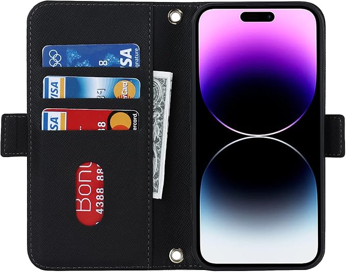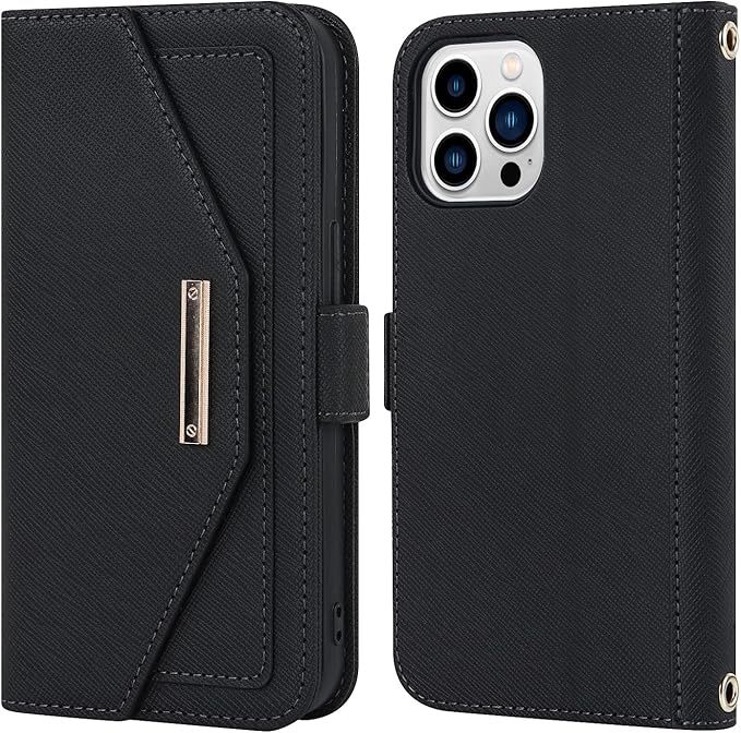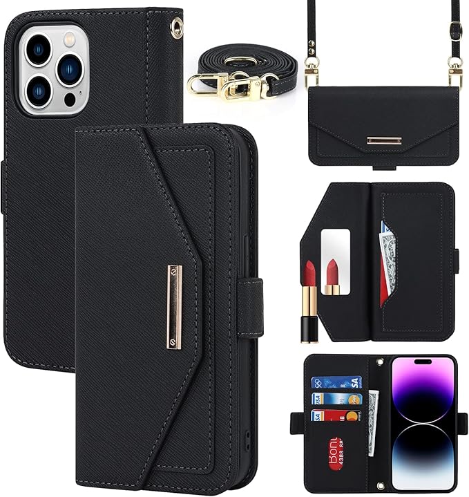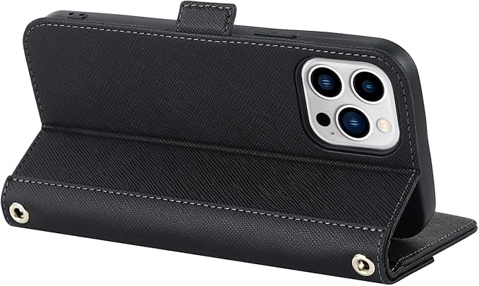 Pelanty for iPhone 14 Pro Max 手帳型ケース 縄掛け肩掛け斜めがけ ショルダー 合成皮革+TPU 携帯カバー 化粧鏡付き ストラップ付き マグネット iPhone14 Pro Max 財布型カバー ICカードポケット お札入れ小銭入れ大容量 収納ポケット スタンド機能 ファスナー付き アイフォン14pro max 耐衝撃(肩縄付き-ブラック)
