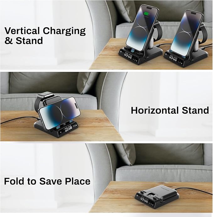 3in1:スマートフォンとイヤホンは有線充電が採用され、iPhone 14/13/12/11/X/8/7/6/5シリーズなどのライトニング ポートのスマホ/イヤホン& Apple Watch全機種は適用。