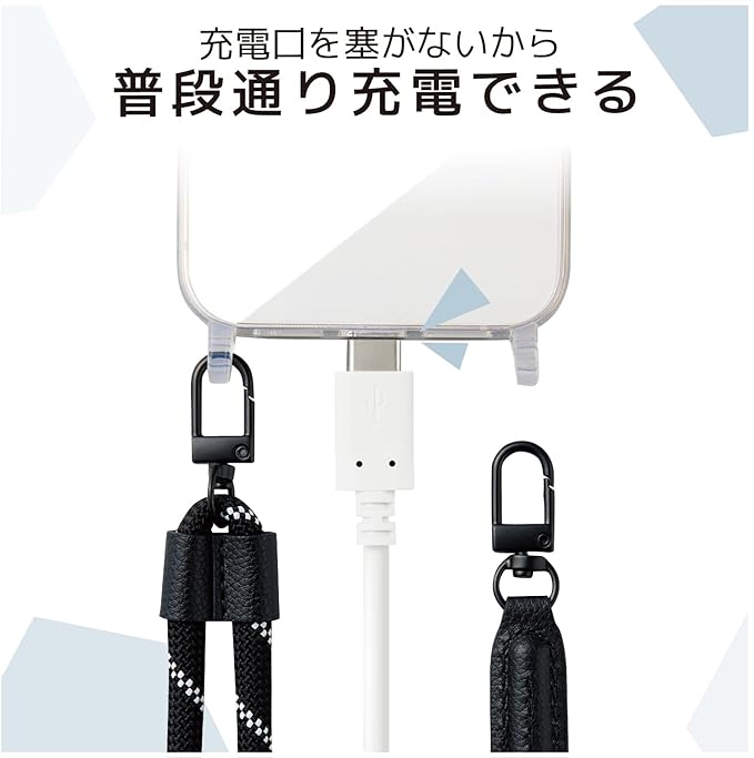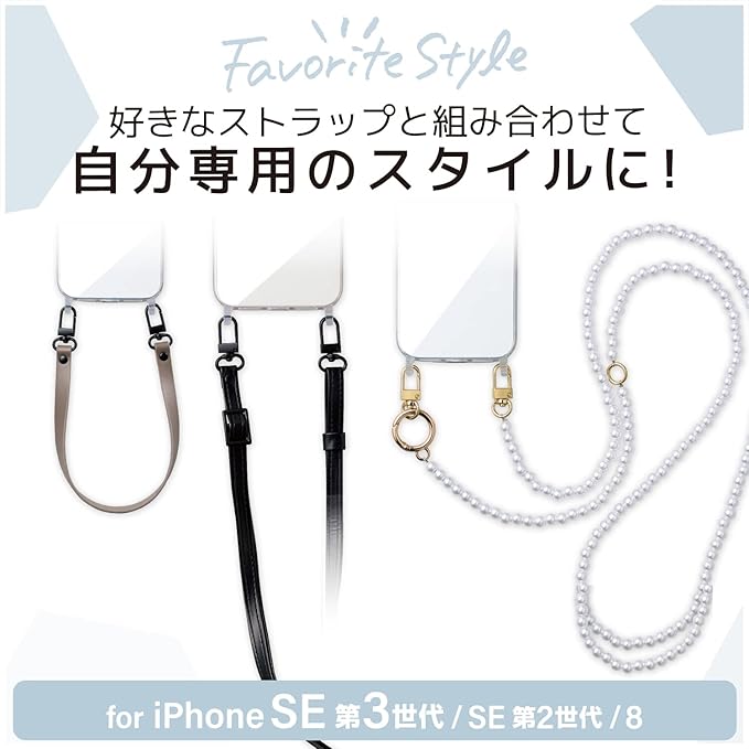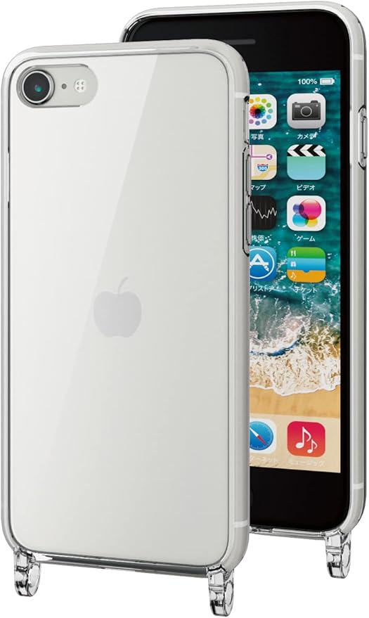 側面に弾力性のあるTPU素材を、背面に強じんで透明度の高いポリカーボネート素材を使用しています。持ち運びに便利なスマホショルダーストラップやハンドストラップが取り付けられる、スリムなスタイルのiPhone SE3、SE2、8、7用ハイブリッドケースです。 本製品にストラップは付属していません。
