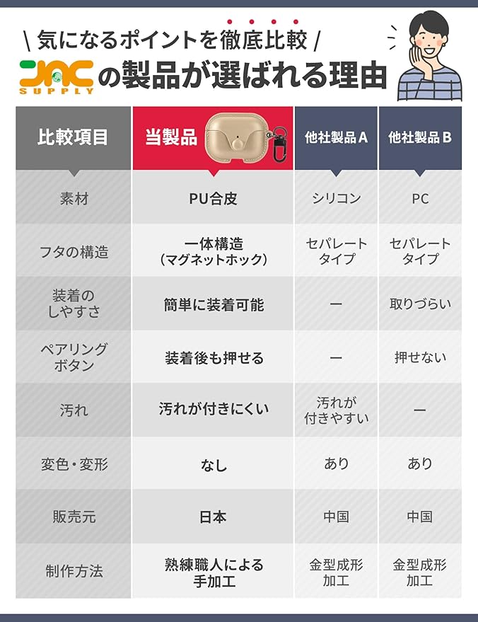 【全面保護/AirPods Pro第1世代/ 第2世代 ケース】/AirPods Proを全面保護する専用airpods pro ケース。本体部分とカバー部分は一体型で、AirPods Proの本体の紛失をしっかりと防止します。カバーの金具には開閉しやすいマグネットホックを採用しています。ご購入直後のご使用時はマグネットホックの磁力で開閉の硬さに個体差がある場合がありますが、品質に問題はありません。一体型のワケケースの本体とフタ部分がセパレートの場合、「持ち歩き時に勝手にカバーのフタが開いて、エアーポッズプロを紛失してしまったことがある」というお客様からのご意見をいただき、一体型を採用しました。