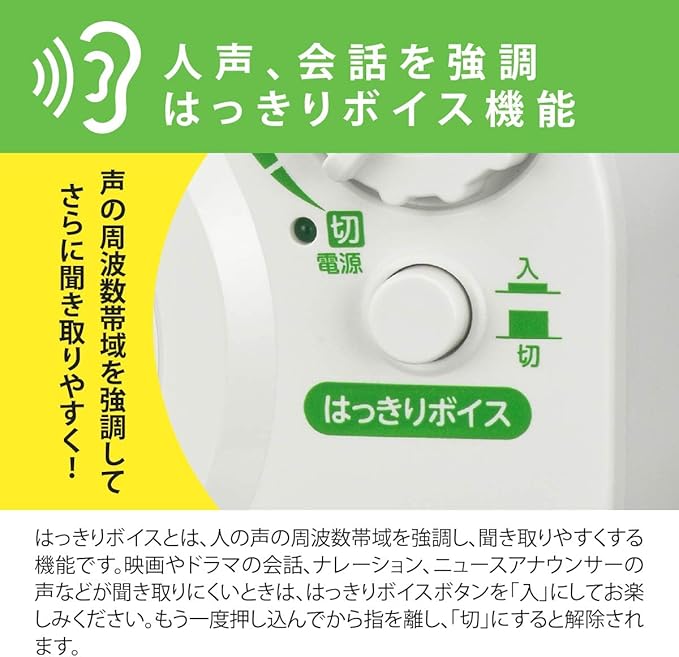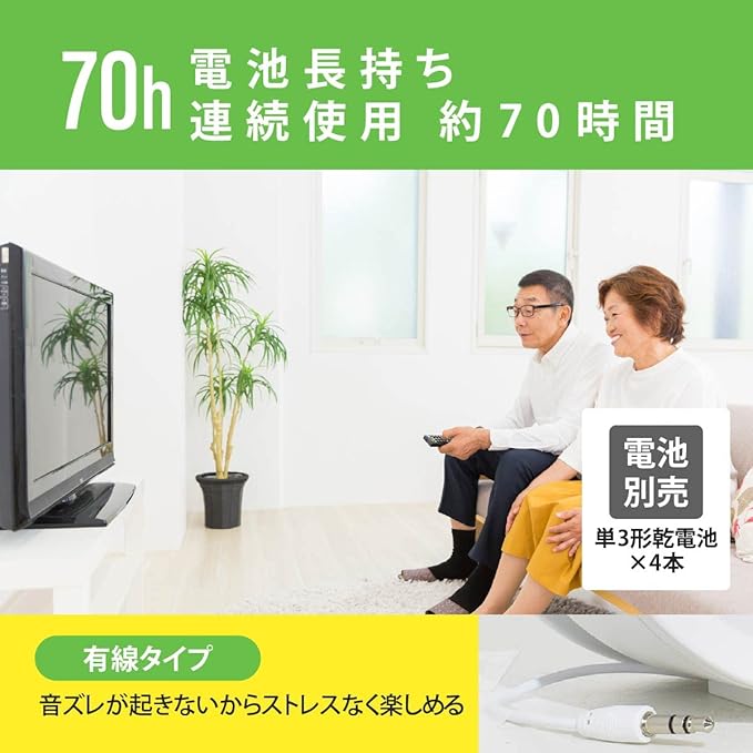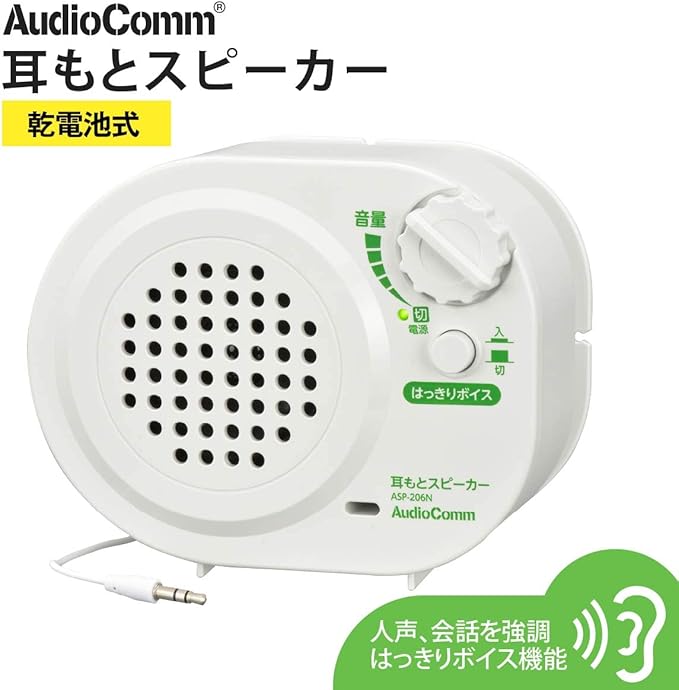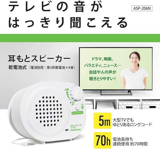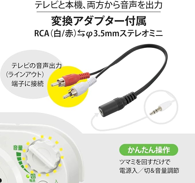 【 特 長 】 テレビの音がはっきり聞こえる耳もとスピーカー 人の声や会話を強調する「はっきりボイス機能」搭載 テレビと本機の両方から音声を出力できる変換アダプター(RCA赤/白⇔φ3.5mmステレオミニ)付属 音ズレが起きずストレスなく楽しめる有線タイプ 大型TVでもゆとりある5mロングコード 約70時間の連続使用ができる電池長持ち仕様 実用最大出力3W、口径66mmスピーカー搭載 ツマミを回すだけで電源入/切と音量調節ができます 5mロングコードは本体にスッキリと巻き取り収納できます