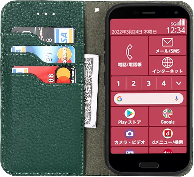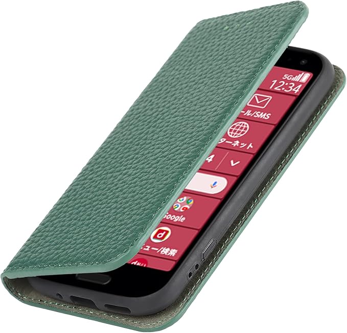Eastwave らくらくスマートフォン スマホカバー F-52bケース 本革 牛革 らくらくスマートフォン F-52B ケース 手帳型 F52Bカバー 手帳 本革 柔らかい 本皮 スプラットホール付き スプラット同梱 内蔵マグネット-ダークグリーン