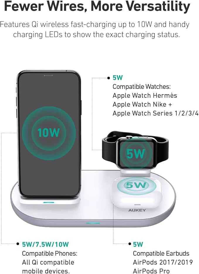 【3か所の充電エリアを搭載】スマートフォン用のワイヤレス充電スタンドと置き型のワイヤレス充電エリアとApple Watch ホルダーの3か所で同時に充電が可能。スマートフォンとワイヤレスイヤホンとApple Watchの同時充電にもおすすめです。