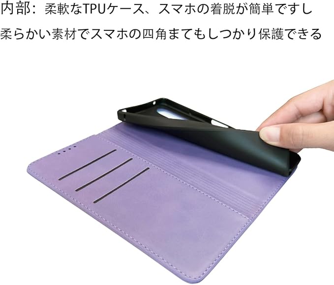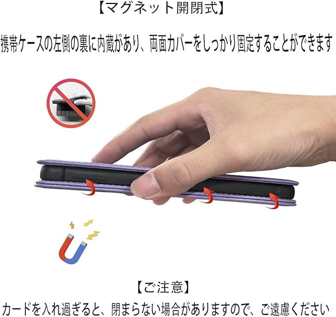 【カードポケット付き】:財布型ケースとして、名刺やお札などを入れるカードポケットがつき、ちょっとしたお出かけにもスマホケース一つでOK日常生活に便利です。ただし、カードを入れ過ぎると、閉まらない場合がありますので、ご遠慮ください。