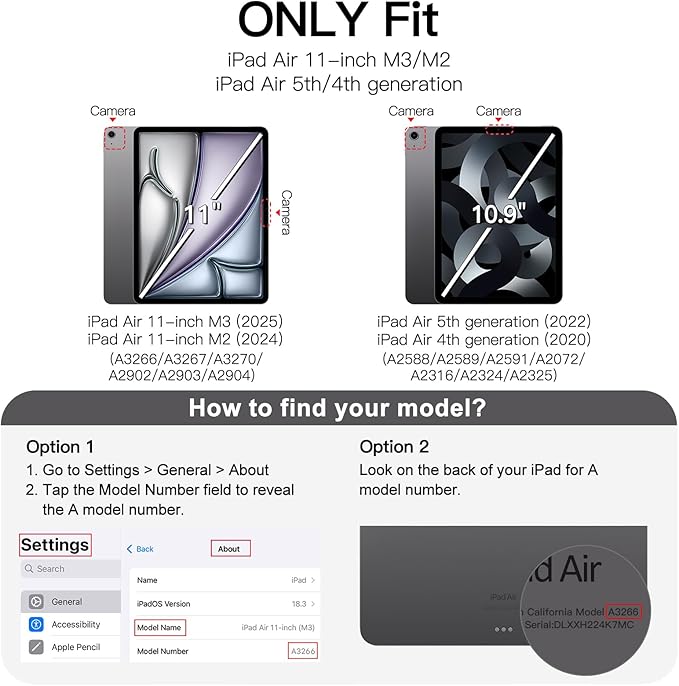 [互換性] iPad Air 11 インチ M3/M2 (2025/2024)、iPad Air 5/4 ケース(10.9インチ、2022/2020モデル、第5/4世代)用に設計されています。適合iPadモデル: A2902 / A2903 / A2904 / A2589 / A2591 / A2324 / A2072 / A2316 / A2325。ご購入の前、おデバイスの裏面にあるモデル番号をご確認ください