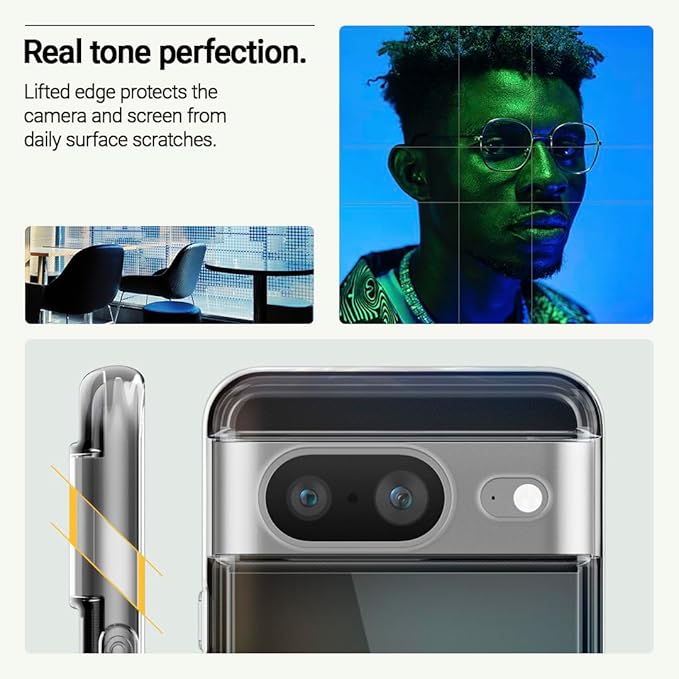【隆起されたリップ】 前面スクリーンと背面カメラの両方に隆起されたリップがあり、Google Pixel 8デバイスを傷から守ることができます。