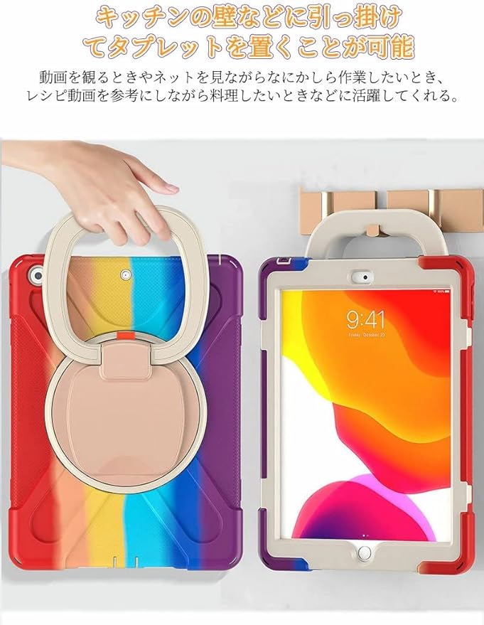iPad Air 13インチ 2025(M3)/2024(M2)/Pro 12.9 第6 5 4 3世代 ケース 縦置き 360 回転持ち手 耐衝撃 ペンシル収納 頑丈 キッズ かわいい 子供 子ども 持ち手付き 肩掛け 斜め掛け アイパッド 可愛く丈夫スタンド ハンドストラップ ショルダーストラップ付き, 虹のピンク