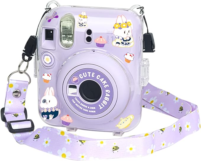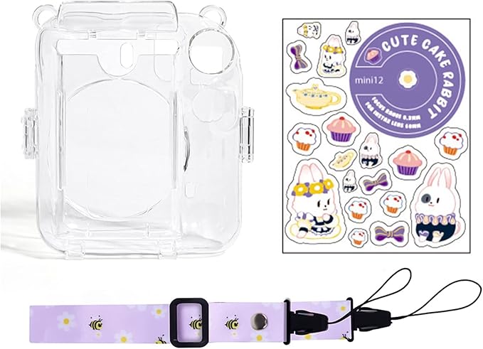 HIYQIN mini12 ケース 富士フイルム Instax Mini 12 カメラ用保護クリアケース クリスタルハードシェルカバー ショルダーストラップ付き カメラステッカー