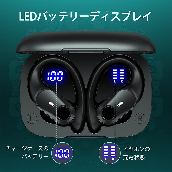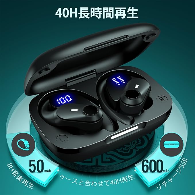 【ワイヤレス充電&LEDディスプレイ】イヤホン ワイヤレスは大容量600mAhの充電ケースがついて、QIとType-C二つの充電方法もサポートしています。フル充電で最大連続約8時間音楽を楽しめます。ケース併用て40時間再生できます。バッテリーが長持ちなので、通勤通学はもちろん、飛行機や新幹線等の長距離移動でも途中でバッテリー切れの心配なく使用できます。LEDディスプレイも付き、高精細と高級感溢れて、ケースのバッテリー残量は左ディスプレイに数字で表示され、イヤホン bluetooth 耳掛けを充電