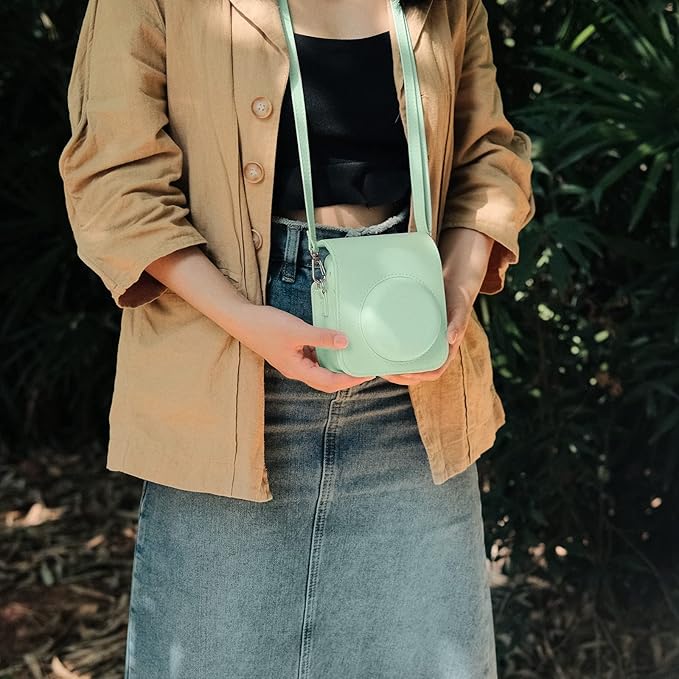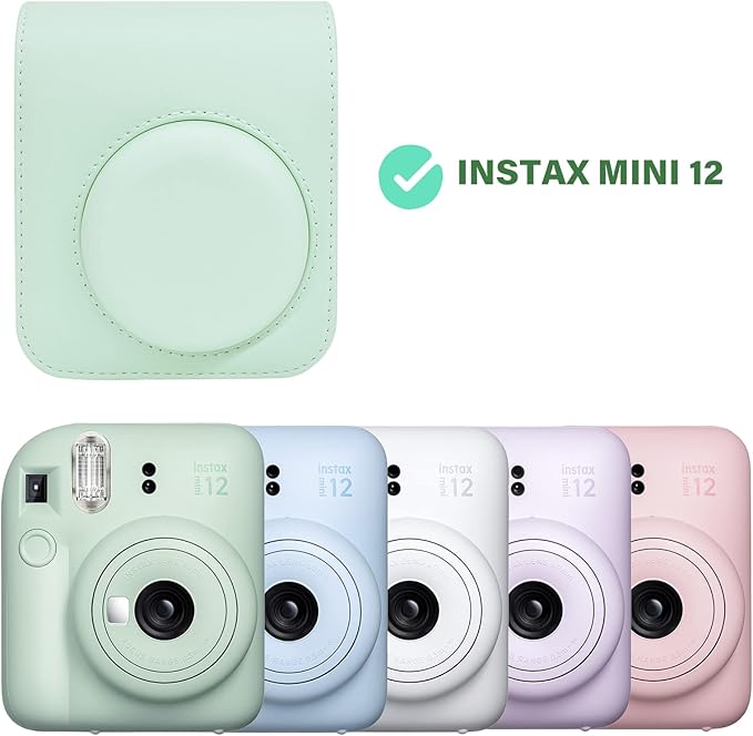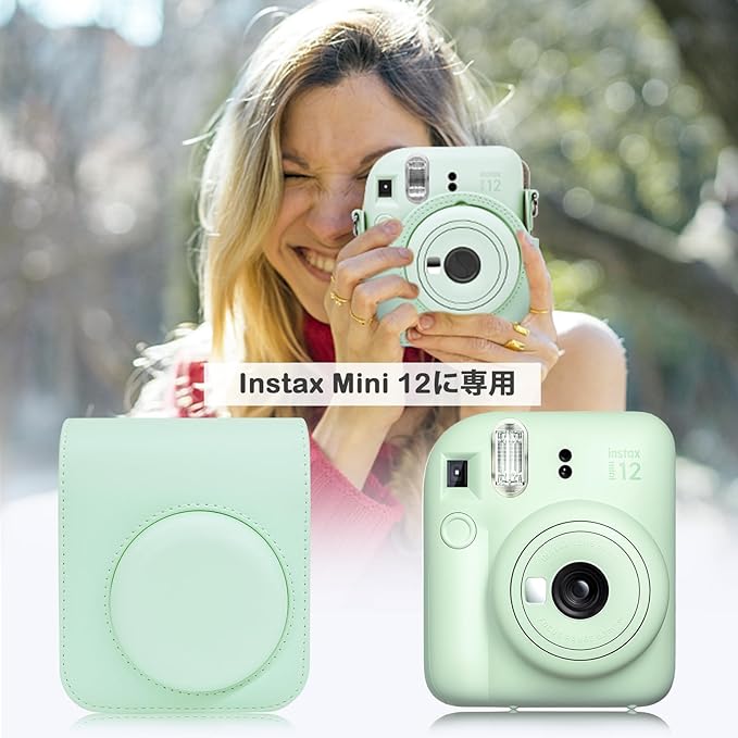 Rieibi instax mini 12ケース、インスタックスミニ 12 ケース Fujifilm チェキ instax mini 12 ケース チェキ12ケース instax mini 12保護カバー instax mini 12収納バッグ PUレザー ショルダーストラップ付 携帯便利 軽量 全面保護 おしゃれ(グリーン)