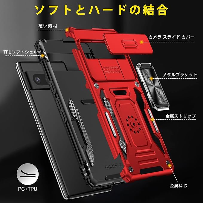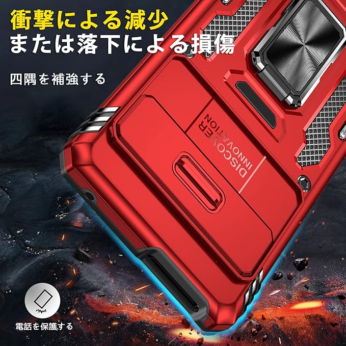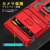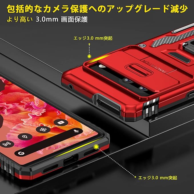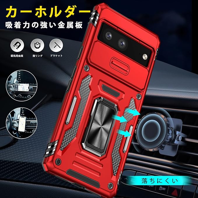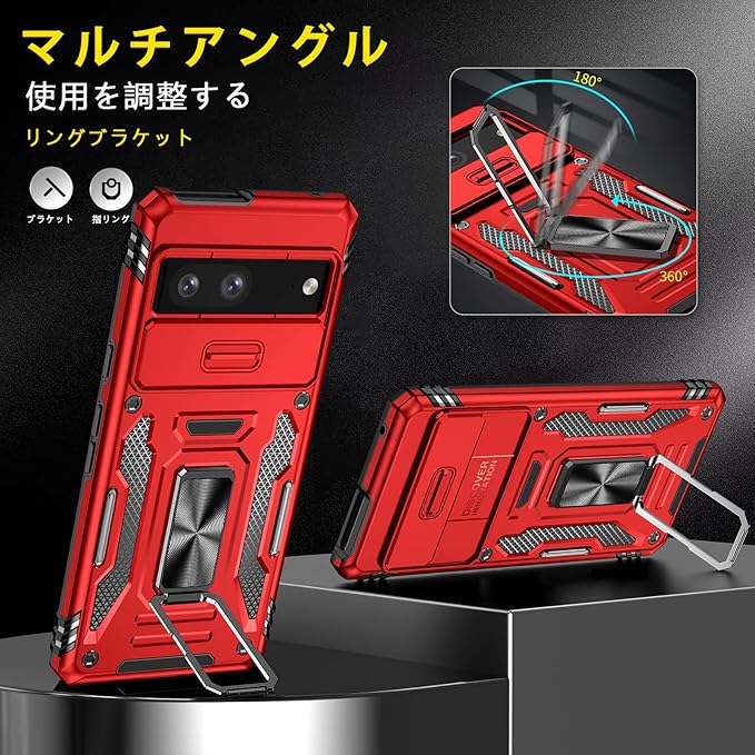 Google Pixel7 ケース リング付き スライド式カメラプロテクター付き 衝撃吸収 保護ケース PC スタンド機能 車載ホルダー対応 米軍MIL規格 金属リング 擦り傷防止 滑り止め Pixel7 カバー カバー 耐衝撃 横置き機能 人気 赤 C92-pixel7-02