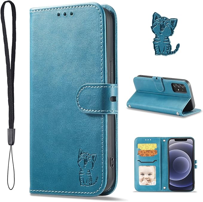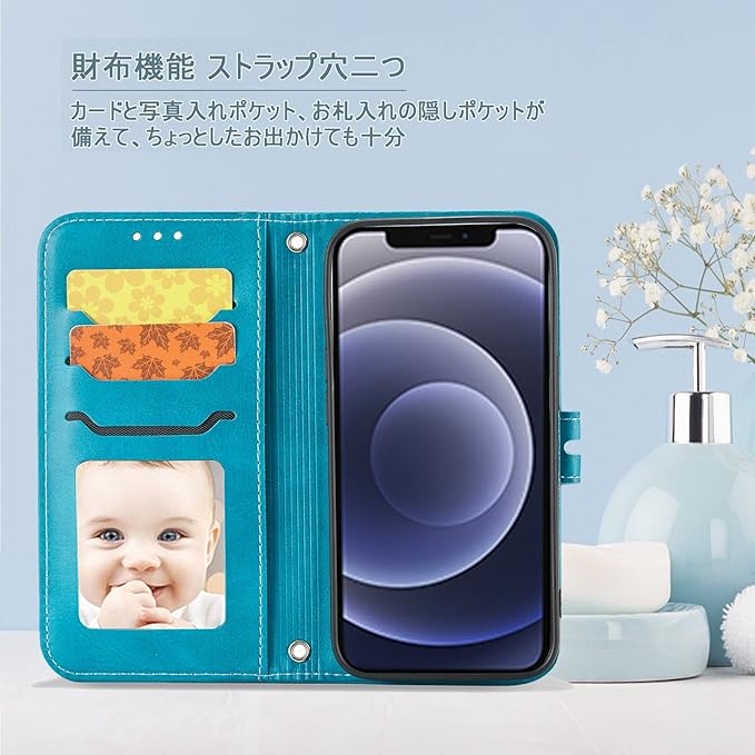 OPPO Reno5 A ケース 手帳型 Reno5A ケース おっぽ りの5aケース オッポリノ5a カバー oppo reno5a手帳型ケース スマートフォン用手帳型ケース 携帯ケース スマイル 笑顔猫ちゃん 猫柄 携帯カバー ストラップ付き カード収納 ベルトマグネット スタンド機能 薄型 男女兼用 (OPPO Reno5 A対応) ターコイズ