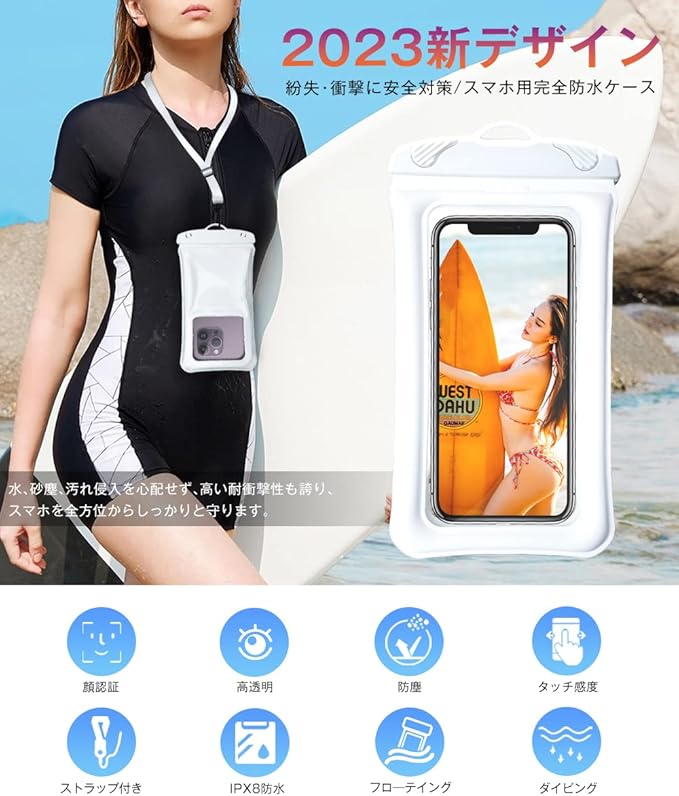 スマホ 防水ケース 水に浮く IP68認証 顔認証 撮影 通話 画面操作 浮き輪 iPhone 14 13 Pro Max 12 11 XR SE Android 7 インチ以下対応 タッチ快適 小物管理 お風呂 海 プール 水泳 温泉など適用 Androidに対応 (ホワイト)