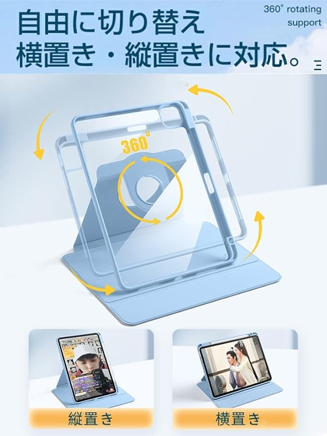 360 回転 iPad Air 11インチ (M3/M2)/Air 第5/4世代 ケース 縦置きスタンド 背面クリア アップルペンシル収納 iPad Air7Air6 Air5 Air4 pro11 2022 透明 ケース かわいい ペン収納 耐衝撃 軽量 薄型, ピンク