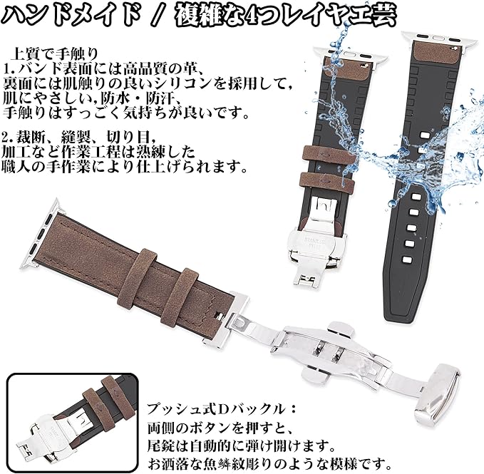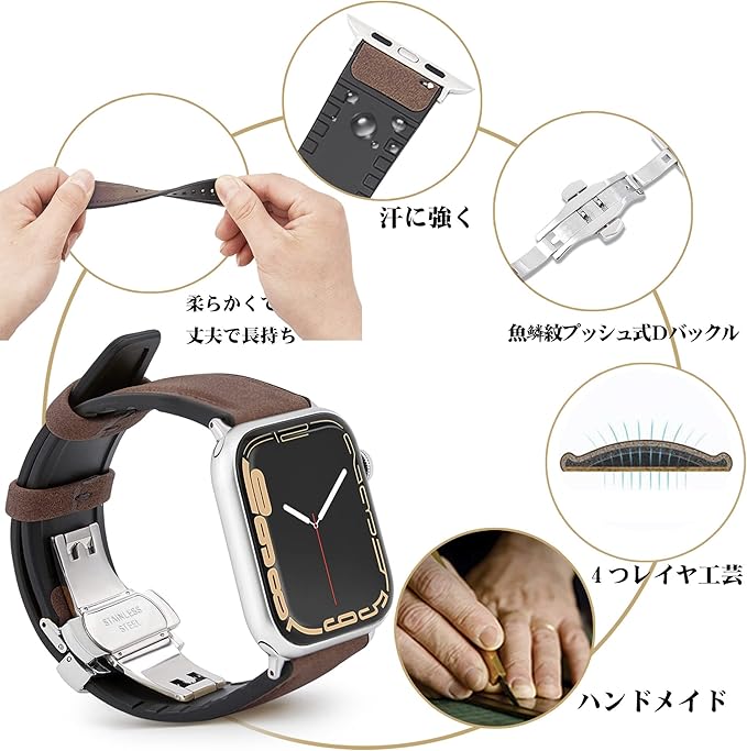 「上質な素材」本製品はアップルウォッチ交換ベルトです。バンド表面には高品質の革、柔らかてなめらかい、裏面には肌触りの良いシリコンを採用して,肌にやさしい,防水・防汗、手触りはすっごく気持ちが良いです。