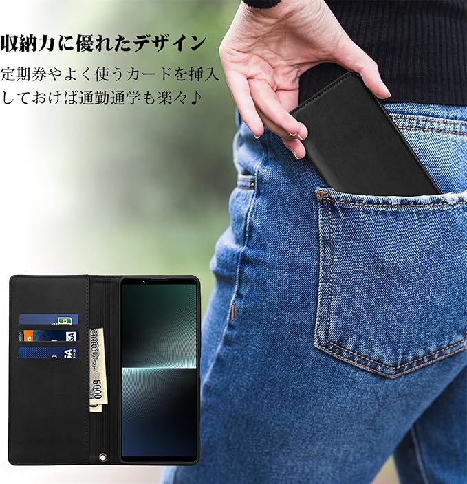 カード収納付き:エクスペリア 1 V 手帳型ケースは電子マネーやクレジットカードなどを入れておくには充分です。入れすぎるとふたが閉じづらくなりますので、ご注意くださいませ。