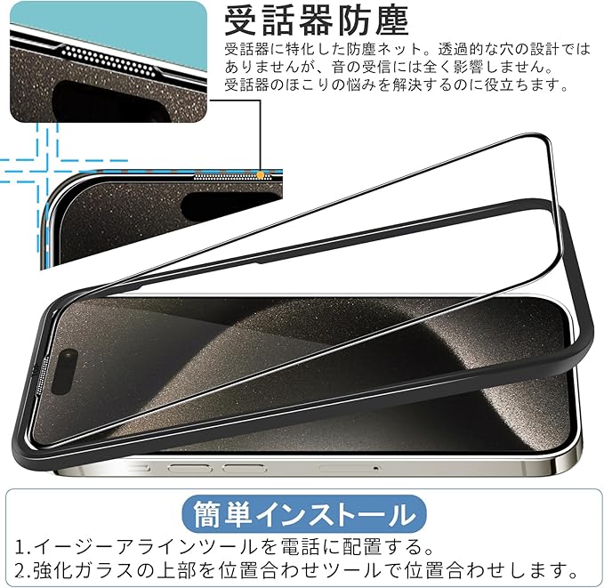 【防塵ネット付き・日本旭硝子素材製】iPhone 15 Pro 専用 ガラスフィルム (2枚/強化黒縁) + カメラフィルム (2枚) ガイド枠付き 受話器防塵 全面保護 AGC 硬度9H 耐衝撃 飛散防止 2.5Dラウンドエッジ 自動吸着 気泡無し 高透過率 強化ガラス クラッチ防止 指紋防止 対応 アイフォン 15 プロ 用 レンズ 液晶 保護 フィルム 【4枚セット】